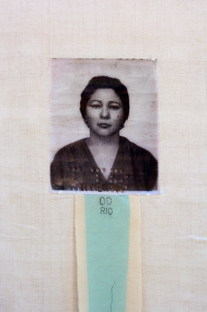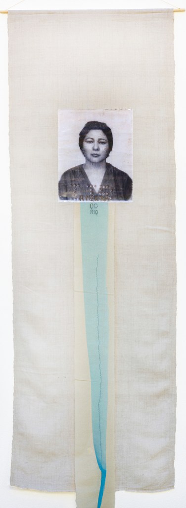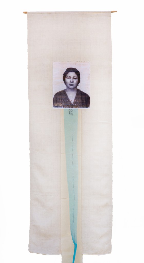 The girl from the river, 2024. Photography, raw cotton, polyester fabric and drawing made with a sewing machine on manufactured linen. 68 x 250 cm.